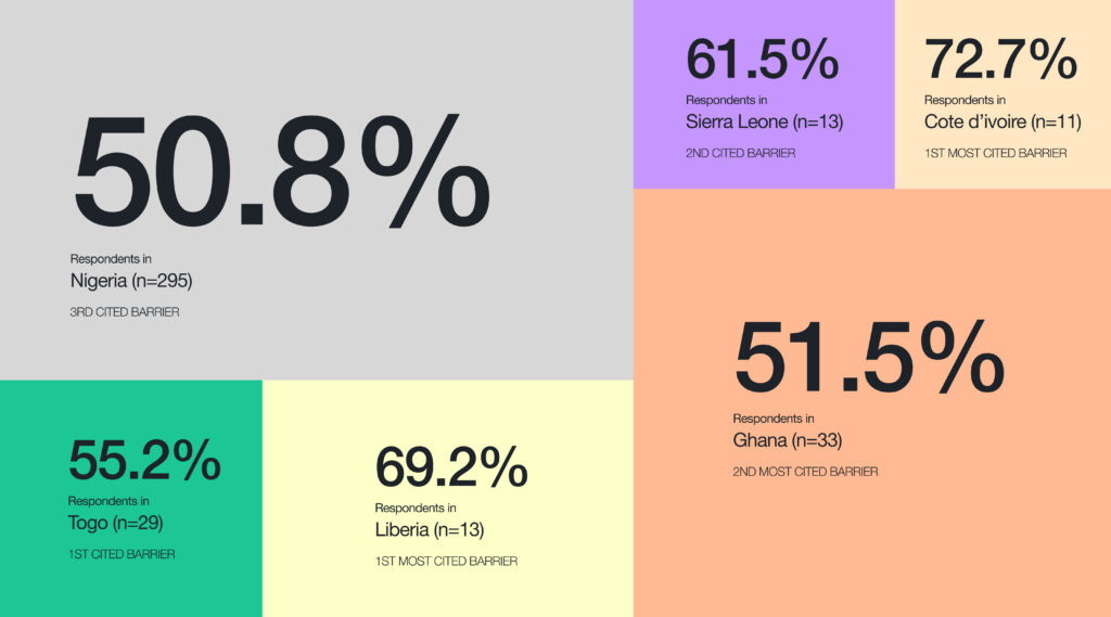 Base: Women in West Africa aged 18+, who mostly reside in urban areas and have access to mobile phones. Percentages indicate the proportion of respondents who answered, “Fear of online scams and harassment” to the question, “What are the top three 3 challenges you often face when using apps or websites?”