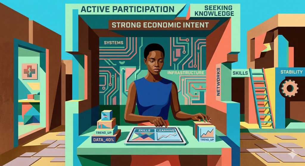 When women engage digital platforms primarily as economic actors, to sell, learn, earn, and manage, their expectations shift. Reliability of the platform matters more, cost sensitivity increases, and the Trust threshold rises.